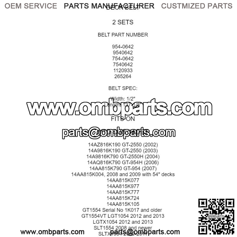 Fits Following MTD Cub Cadet Models:14AZ816K190 GT-2550 (2002)14A9816K190 GT-2550 (2003)14A9816K790 GT-2550H (2004)14AQ816K790 GT-954H (2006)14AA815K790 GT-954 (2007)14AA815K004, 2008 and 2009 with 54″ decks14AA815K07714AA815K97714AA815K77714AA815K72414AA815K105GT1554 Serial No 1K017 and older GT1554VT LGT1054 2012 and 2013LGTX1054 2012 and 2013SLT1554 2008 and newerSLTX1054 2009-2011