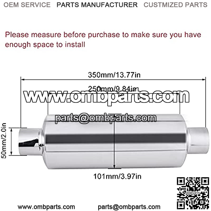[Size] OD of inlet/outlet: 2.0 inch; Overall length: 13.77 inch; Body diameter: 3.98 inch.