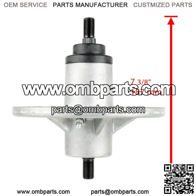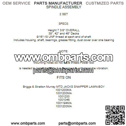 SPECS:Height 7 3/8″ OVERALL38″, 42″ and 46″ Decks9/16″-18 UNF thread at each end of shaftIncludes housing, shaft, bearings, grease fitting, dust cover over one bearing