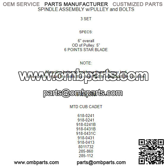 3 Spindle Assembly W/Pulley Bolt For MTD Cub Cadet 918-0431C 618-0431C 8011732