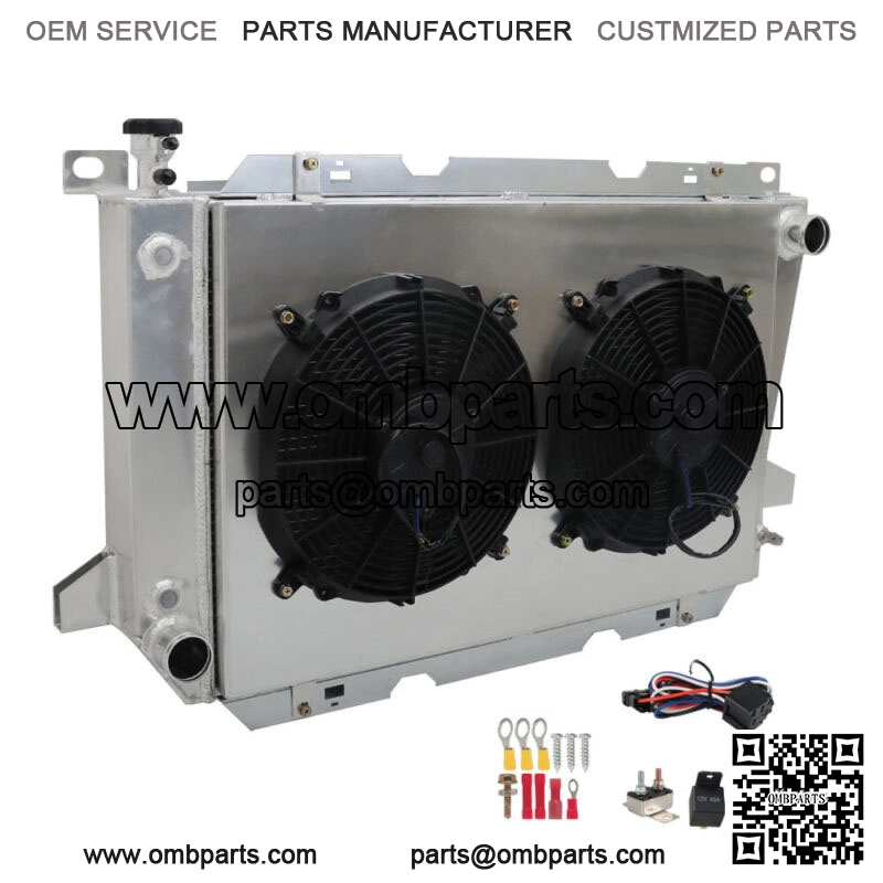 BLACK goes to thermos switch.BLUE wire goes to the Fans. Radiator Size:Row Count: 4 RowsCore Size: 18-3/8″ H x 27-1/2″ L