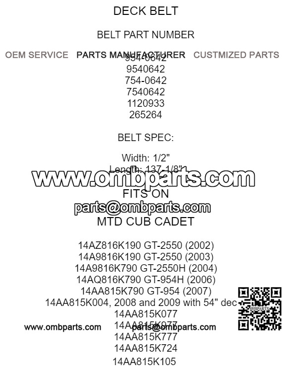 Fits Following MTD Cub Cadet Models:14AZ816K190 GT-2550 (2002)14A9816K190 GT-2550 (2003)14A9816K790 GT-2550H (2004)14AQ816K790 GT-954H (2006)14AA815K790 GT-954 (2007)14AA815K004, 2008 and 2009 with 54″ decks14AA815K07714AA815K97714AA815K77714AA815K72414AA815K105