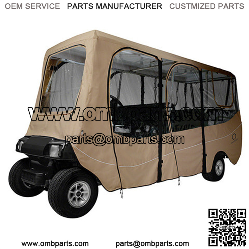 Want to enjoy your 6-Passenger golf cart in all types of weather Need to keep your customers or passengers dry Look no further than our high-quality universal deluxe golf cart enclosure! Our 6-passenger Deluxe enclosures have heavy-duty protective vinyl doors made of long-lasting 10-ounce tarpaulin with 12-gauge, marine-grade, super clear PVC windows. What does that mean for you …It’s TOUGH!