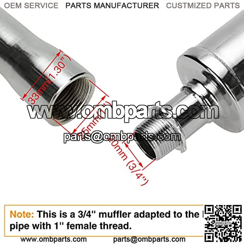 ??Features??This is a 3/4″ muffler adpted to the header pipe with 1″ female thread.Easy to install.Nice welds and excellent chrome polish. It brings out the lowend sounds and it does not sound raspy at all.