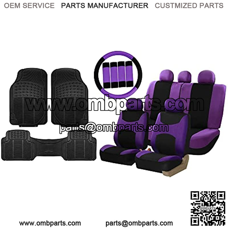 FH Group Light & Breezy Cloth Full Set Car Seat Covers (Purple/Black) Combo Set: Steering Wheel Cover, Seat Belt Pads and Black Vinyl Floor Mats ?C Universal Fit for Cars Trucks & SUVs