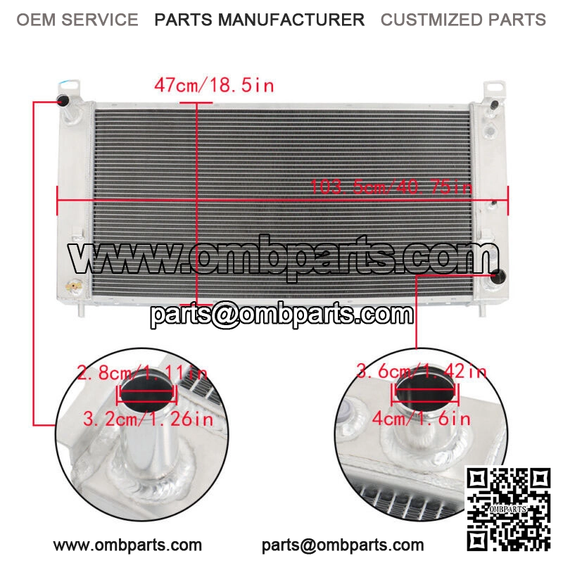 Radiator Size:Material: Full AluminumHigh Performance Racing Spec.3-Row of tubes Core Racing DesignCore Size: 33 6/7″ x 17 5/8″Overall Size: 40 1/3″ x 21 3/7″Transmission Oil Cooler: 5/8-18UNFTransmission Oil Cooler: Include ( Notes: Only one side has oil cooler, Engine Oil Cooler is not included)Interchange Part Number: CU2423, GM3010275, GM3010475, Q2423, RAD2423, 15193108, 15252638, 15841571, 2423, 52486595, 52487604 Package Include:1 X 3-Row AA5052 Aluminum Radiator Application:For 2002 – 2013 Cadillac Escalade Base 5.3L, 6.0L & 6.2LFor 2011 – 2013 Cadillac Escalade Luxury 6.2LFor 2008 – 2013 Cadillac Escalade Platinum 6.2LFor 2012 Cadillac Escalade Special Edition 6.2LFor 2005 – 2013 Cadillac Escalade ESV 6.0L & 6.2LFor 2005 – 2008 Cadillac Escalade EXT 6.0L & 6.2LFor 2007 – 2013 Chevrolet Avalanche 5.3L & 6.0LFor 2002 – 2006 Chevrolet Avalanche 1500 5.3L All TrimsFor 2005 – 2012 Chevrolet Silverado 1500 Base 4.3LFor 2003 – 2005 Chevrolet Silverado 1500 Base 4.8LFor 1999 – 2008 Chevrolet Silverado 1500 Base 5.3LFor 2002 Chevrolet Silverado Custom 4.3LFor 2004 – 2006 Chevrolet Silverado 1500 Hybrid 5.3LFor 2005 – 2011 Chevrolet Silverado 1500 LS 4.3LFor 2003 – 2013 Chevrolet Silverado 1500 LS 4.8LFor 1999 – 2013 Chevrolet Silverado 1500 LS 5.3LFor 2005 Chevrolet Silverado 1500 LS 6.0LFor 2005 Chevrolet Silverado 1500 LT 4.3LFor 2003 – 2013 Chevrolet Silverado 1500 LT 4.8For 1999 – 2013 Chevrolet Silverado 1500 LT 5.3LFor 2005 – 2009 Chevrolet Silverado 1500 LT 6.0LFor 2010 – 2013 Chevrolet Silverado 1500 LT 6.2LFor 2007 – 2013 Chevrolet Silverado 1500 LTZ 5.3L, 6.0L & 6.2LFor 2005 – 2006 Chevrolet Silverado 1500 SS 6.0LFor 2005 – 2013 Chevrolet Silverado 1500 WT 4.3LFor 2003 – 2013 Chevrolet Silverado 1500 WT 4.8LFor 2002 – 2013 Chevrolet Silverado 1500 WT 5.3LFor 2010 – 2013 Chevrolet Silverado 1500 XFE 5.3LFor 2004 Chevrolet Silverado 1500 Z71 4.3L, 4.8L & 5.3LFor 2007 Chevrolet Silverado 1500 Classic 4.3L, 4.8L, 5.3L & 6.0LFor 2001 – 2006 Chevrolet Silverado 1500 HD 6.0LFor 2007 Chevrolet Silverado 1500 HD Classic 6.0LFor 2003 – 2005 Chevrolet Silverado 2500 400 SS 5.3LFor 2011 – 2012 Chevrolet Silverado 2500 Base 4.8LFor 1999 – 2012 Chevrolet Silverado 2500 Base 5.3LFor 1999 – 2000 Chevrolet Silverado 2500 Base 6.0LFor 2007 Chevrolet Silverado 2500 Cheyenne 5.3LFor 2013 Chevrolet Silverado 2500 LS 4.8LFor 1999 – 2013 Chevrolet Silverado 2500 LS V8 5.3LFor 1999 – 2000 Chevrolet Silverado 2500 LS 6.0LFor 1999 – 2000 Chevrolet Silverado 2500 LT 5.3LFor 1999 – 2000 Chevrolet Silverado 2500 LT 6.0LFor 2000 – 2014 Chevrolet Suburban 1500 5.3L All TrimsFor 2000 Chevrolet Suburban 2500 6.0L All TrimsFor 2000 – 2014 Chevrolet Tahoe 4.8L, 5.3L & 6.2L All TrimsFor 2005 GMC Sierra 1500 Base 4.3L & 4.8LFor 2002 – 2005 GMC Sierra 1500 Base 5.3LFor 2005 – 2013 GMC Sierra 1500 Denali 6.0L & 6.2LFor 2005 – 2006 GMC Sierra 1500 Hybrid 5.3LFor 2006 GMC Sierra 1500 SL 4.3LFor 2006 – 2013 GMC Sierra 1500 SL 4.8LFor 2003 – 2013 GMC Sierra 1500 SL 5.3LFor 2005 – 2013 GMC Sierra 1500 SLE 4.8LFor 2003 – 2013 GMC Sierra 1500 SLE 5.3LFor 2005 – 2009 GMC Sierra 1500 SLE 6.0LFor 2010 – 2013 GMC Sierra 1500 SLE 6.2LFor 2003 – 2013 GMC Sierra 1500 SLT 5.3LFor 2005 – 2009 GMC Sierra 1500 SLT 6.0LFor 2009 – 2013 GMC Sierra 1500 SLT 6.2LFor 2005 – 2013 GMC Sierra 1500 WT 4.3L & 4.8LFor 2003 – 2013 GMC Sierra 1500 WT 5.3LFor 2010 – 2013 GMC Sierra 1500 XFE V8 5.3LFor 2007 GMC Sierra 1500 Classic 4.3L, 4.8L, 5.3L & 6.0L All TrimsFor 2001 – 2006 GMC Sierra 1500 HD 6.0L All TrimsFor 2007 GMC Sierra 1500 HD Classic 6.0L All TrimsFor 1999 – 2000 GMC Sierra 2500 5.3L & 6.0L All TrimsFor 2007 – 2012 GMC Yukon Base 5.3L & 6.2LFor 2001 – 2014 GMC Yukon Denali 6.0L & 6.2LFor 2006 GMC Yukon SL 4.8L & 5.3LFor 2000 – 2014 GMC Yukon SLE & SLT 4.8L & 5.3LFor 2000 – 2014 GMC Yukon XL 1500 5.3L & 6.2L All TrimsFor 2000 GMC Yukon XL 2500 6.0L All TrimsFor 2008 – 2009 Hummer H2 Adventure, Base, Luxury 6.2LFor both Automatic And Manual Transmission Notes??Please make sure the part numbers match the part you are replacing.