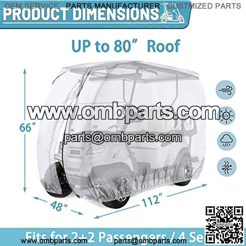 The extra PU coating and by adding the water-proof adhesive tape in the stitching area, 100% waterproof.112 inches L x 48 inches W x 66 inches H, suitable for most golf carts with extended 80″L roofs, 2 rear seats, armrests and footrest.such as Yamaha, Honda, Club Car, EZGO.The zipper is designed to be a place that will be convenient to allow access to cart without removing the cover totally