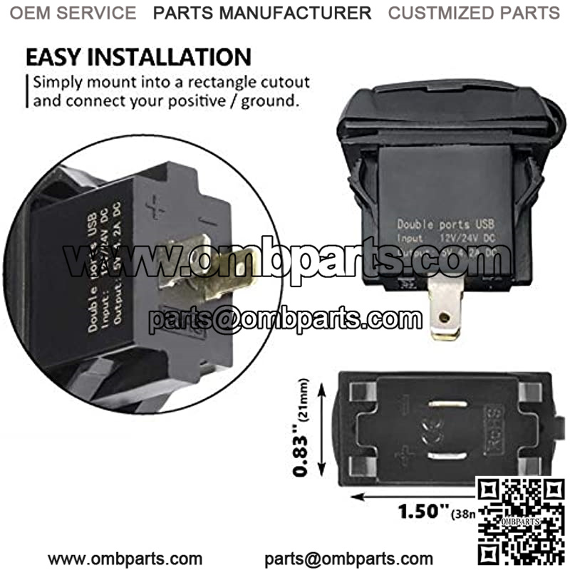 Input: 12 to 24 volts DC5vdc, dual 2.1A USB outputs up to 4.2A totalCE and RoHS certified