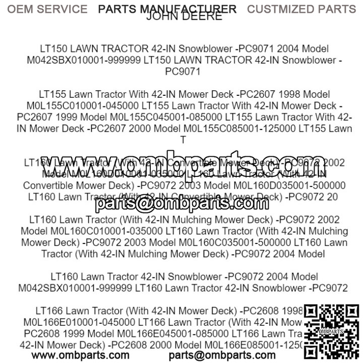 LT160 Lawn Tractor (With 42-IN Mulching Mower Deck) -PC9072 2002 Model M0L160C010001-035000 LT160 Lawn Tractor (With 42-IN Mulching Mower Deck) -PC9072 2003 Model M0L160C035001-500000 LT160 Lawn Tractor (With 42-IN Mulching Mower Deck) -PC9072 2004 Model
