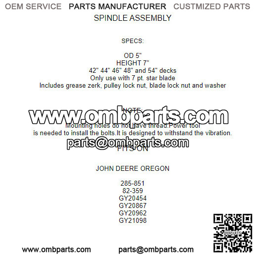 Fits Following John Deere Oregon Models:285-85182-359GY20454GY20867GY20962GY21098 SPECS:OD 5″HEIGHT 7″42″ 44″ 46″ 48″ and 54″ decksOnly use with 7 pt. star bladeIncludes grease zerk, pulley lock nut, blade lock nut and washer