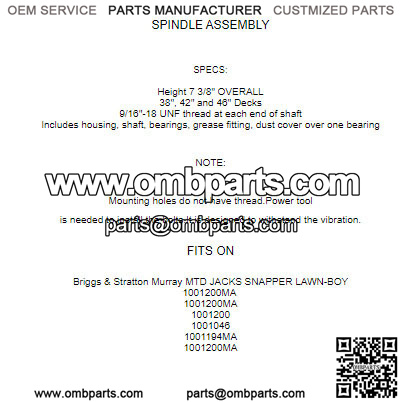 SPECS:Height 7 3/8″ OVERALL38″, 42″ and 46″ Decks9/16″-18 UNF thread at each end of shaftIncludes housing, shaft, bearings, grease fitting, dust cover over one bearing